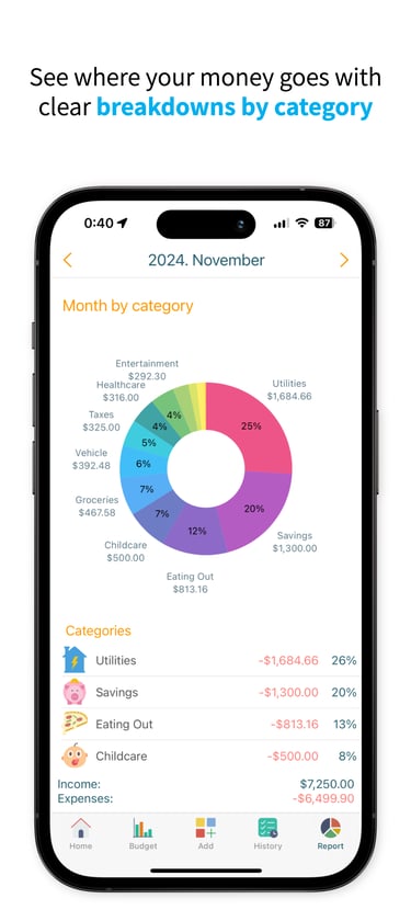 Visualize your spending with pie charts and bar graphs. Spot seasonal trends, monitor progress toward savings goals, and get a bird’s-eye view of your financial health.