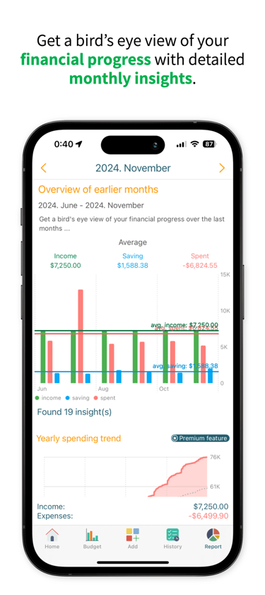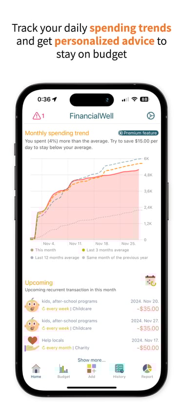 Get insights into your daily spending patterns with trend line charts. Receive personalized advice if you’re overspending and compare trends with previous months or years.
