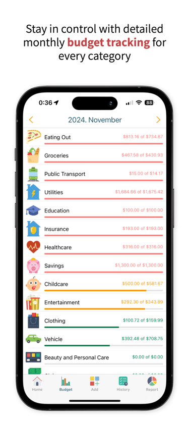 Set and adjust your budget limits by category. Choose a fixed amount or let the app auto-adjust based on your average spending.